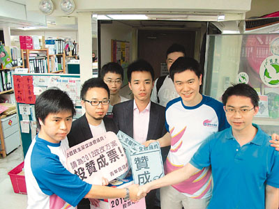 ■青年民建聯首次到訪民主黨總部呼籲該黨議員投票支持政改方案。右二為周浩鼎。