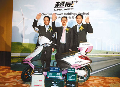 ■左起:超威動力控股副總裁高鑫坤、主席周明明及財務總監吳智傑出席投資者推介會。 本報記者張偉民 攝