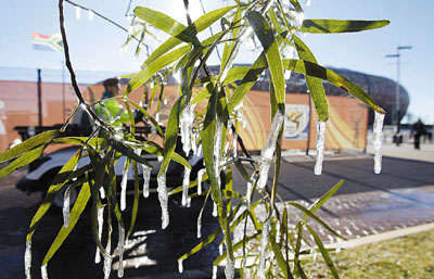 【綜合外電】D組的加納隊在羅斯頓堡以北的駐紮大本營繼續備戰,不過,訓練場的草地因為嚴寒天氣而結冰,昨天的練習課要押後兩小時才開始。兩周前,南非仍有和暖的25度氣溫,但近日卻因冷鋒襲至而下降到接近零度。■梁志達