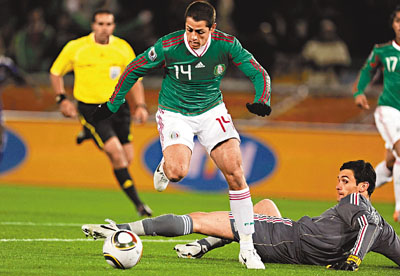 【綜合外電】墨西哥今仗有前鋒卡路士韋拿傷出,下輪分組賽難望披甲,不過隊中另一位前鋒查維亞靴南迪斯卻狀態大勇,昨晨一役,這位22歲的英超曼聯新兵在64分鐘突破越位接應妙傳,冷靜扭過門將射入空門,攻入世盃史上第2100球。