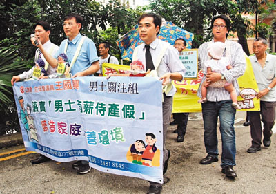 工聯會立法會議員王國興昨日與約10名「男士關注組」成員到中環政府總部遞交請願信,要求當局體諒剛為人父的打工仔渴望全程照料初生嬰兒和太太,馬上立法推行男士有薪侍產假。工聯會指出,現時有不少地區,如韓國、捷克、新加坡及台灣等均已推行男士有薪侍產假;內地多個省市亦已推行相關政策,其中深圳男士更享有30天侍產假。