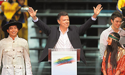 哥倫比亞大選第2輪投票前日結束,現年58歲的保守派前國防部長桑托斯(見圖)以大比數勝出,料會延續現任總統烏里韋的親美國立場。雖然哥國和反美的委內瑞拉關係緊張,但桑托斯表示將邀請委國總統查韋斯,出席其就職典禮。