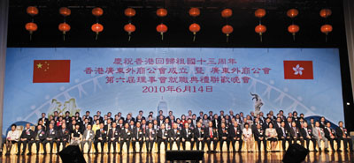 ■2010年6月14日晚,「慶祝香港回歸祖國13周年——香港廣東外商公會成立暨廣東外商公會第六屆理事會就職典禮聯歡晚會」在香港會議展覽中心大會堂隆重舉行。晚會筵開150席,超過1800名來自內地、香港及澳門的政商名流齊聚一堂,冠蓋雲集,令晚會現場熠熠生輝。