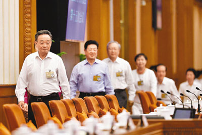 ■昨日,十一屆全國人大常委會十五次會議在北京人民大會堂開幕,會議由人大委員長吳邦國主持。圖為吳邦國步入會場。中新社