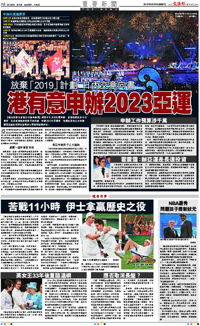 他同時強調,特區政府致力於推動香港的體育發展,相信舉辦亞運會將鼓勵運動員提高水準,提升市民對體育的興趣和參與,以及鼓舞社會士氣。香港於去年12月成功舉辦了東亞運動會,其節儉務實、因地制宜的辦賽方式給人留下了深刻印象;但在客觀條件上,部分場館設施分散且陳舊以及沒有運動員村,成為舉辦更大規模、更高級別賽事的障礙。據悉,在2021年前,在地處九龍半島南岸、維多利亞港之濱的原啟德機場區域內,將建成一個綜合體育場館區。
