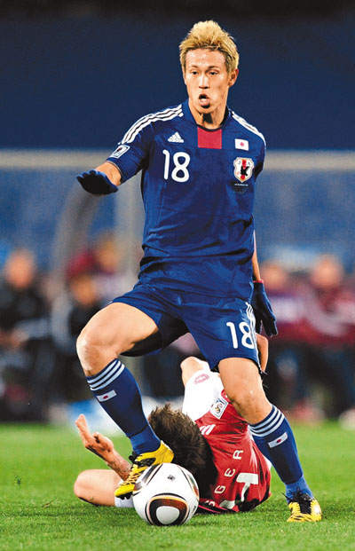 今屆世盃接連轟破喀麥隆與丹麥大門的本田圭佑昨晨射入一記金球,貢獻出一射一傳,連英國廣播公司的旁述也將他譽為「日本C.朗拿度」。這位兩周前才滿24歲的新星身高1米82,擅於中遠距離勁射和處理罰球。他在2008年由名古屋鯨魚加盟荷甲芬洛,入球頻頻,今冬轉投莫斯科中央陸軍後更在歐聯光芒四射。