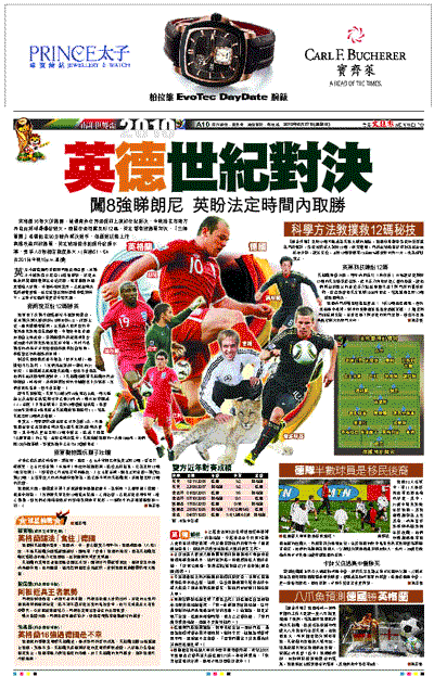 英格蘭16強火併德國,這場南非世界盃提前上演的世紀對決,今晚將在布隆方丹自由邦球場爆發戰火。歷屆世盃每當互射12碼,英足都會被德軍淘汰,「三獅軍團」希望能在90分鐘內解決對手,但面對狀態上佳與進攻銳利的德軍,英足戰將若未能提升發揮水準,要爭入8強相信難度甚大。(有線61、64及201台今晚10p.m.直播)