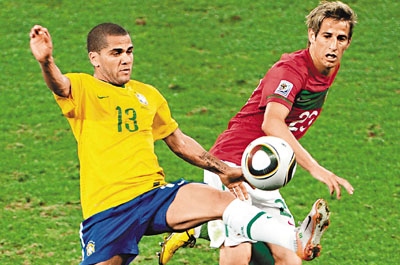 ■巴西的丹尼爾(左)力壓葡萄牙的法比奧干查奧進攻。法新社