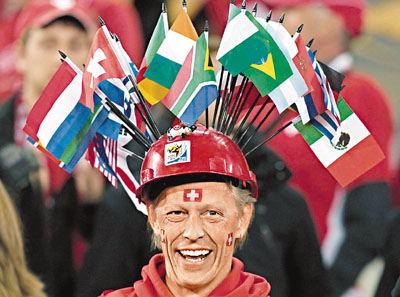 ■瑞士球迷自製打氣帽,插上32支參賽球隊國旗為世盃打氣外,亦宣揚世界和平訊息。美聯社