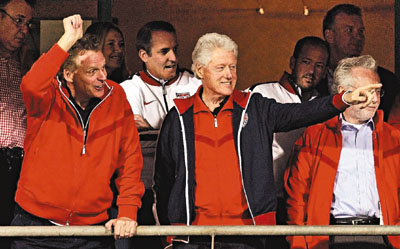 美國前總統克林頓(中)亦為美國對加納大戰的座上客。 美聯社