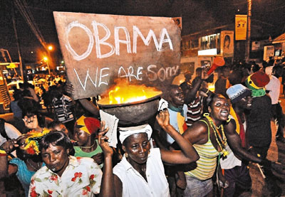有加納球迷於國足擊敗美國殺入世盃8強後,於場外舉起火盆慶祝,更於火上燃燒寫著「對不起 奧巴馬」的紙牌。 法新社