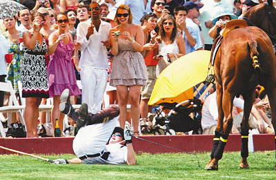 英國王位第3繼承人哈里王子前日在美國紐約總督島參加慈善馬球比賽,期間被馬匹拋下,一屁股跌坐地上,全場譁然,但25歲、身手敏捷的哈里並無大礙,即時自行起身,迅速上馬再賽,獲現場觀眾歡呼支持。