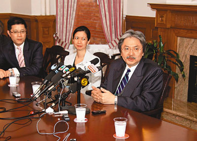 曾俊華昨日(多倫多時間27日)在多倫多以中國代表團成員身份,出席20國集團峰會會議後會見傳媒。旁為多倫多香港經濟貿易辦事處處長蕭慕蓮。