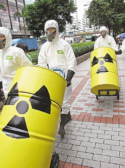 ■綠色和平成員身穿防化衣,將兩個象徵核廢料的鐵桶送到環境局。該組織希望政府能在月底前公開增加使用核電的研究,還公眾「核電知情權」。實習記者曹人穎 攝