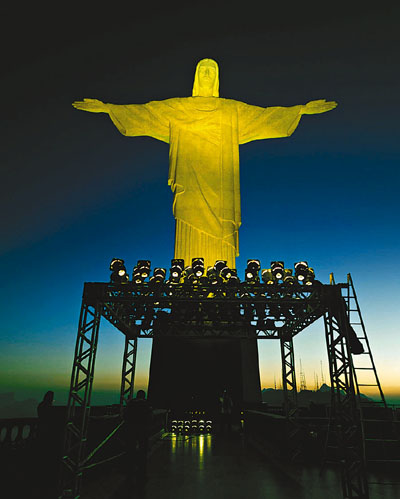 ■修繕一新的里約熱內盧著名基督像,在晚霞與巴西國家隊制服同一顏色的黃色燈光襯托下,格外耀眼。法新社