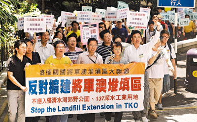 【本報訊】(記者 嚴敏慧)數十名反對擴建將軍澳堆填區的將軍澳區居民,昨日由中環匯豐銀行總行遊行到政府總部。有西貢區區議員批評,政府漠視堆填區臭味和衛生問題對居民的影響,更將堆填區範圍擴展至郊野公園內,是極壞的先例。遊行人士促請政府盡快回應訴求,徹底解決問題。