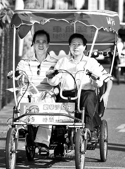 ■郭聲琨(右)5日早上在彰化縣一景區感受腳踏車觀光樂趣。 中新社