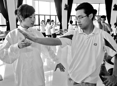 中醫藥傳統文化研習營5日在福州開營,來自兩岸60多名大學生歡聚福建中醫藥大學。圖為台生於開營式上學習太極拳。 新華社