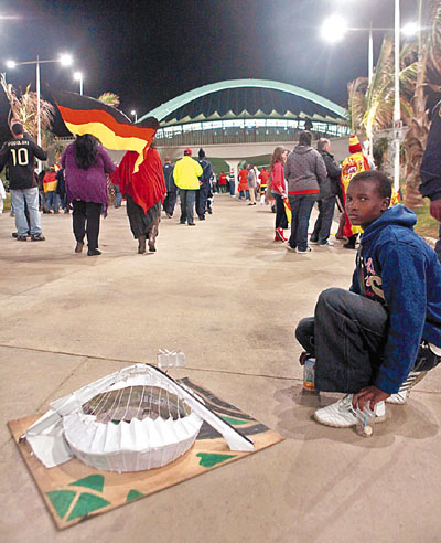 ■一名南非生意人在街邊擺賣紙製德班球場模型,可惜無人光顧。 法新社