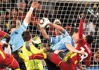 烏拉圭前鋒蘇亞雷斯救空門,蓄意犯手球。法新社