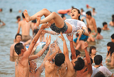 第11屆台北縣貢寮海洋音樂祭9日在福隆海水浴場舉行,民眾在海邊玩水消暑,樂不可支。中央社
