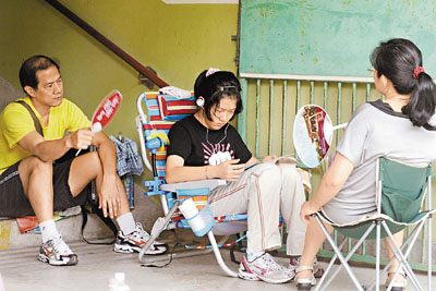 台灣第2次公立中學基本學力測驗10日登場。陪考的家長找好陰涼的位置,配上手動、電動扇子來為考生降溫。 中央社