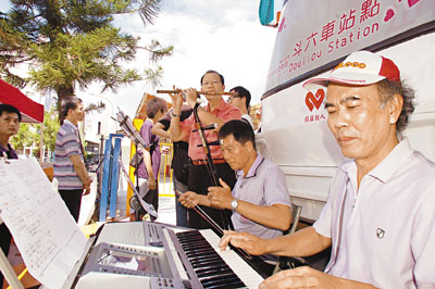 雲林縣生命線協會10日在斗六車站辦捐血活動,甫入選雲林縣街頭藝人的張松貴(右)與樂友們,在現場演奏悠揚音樂,讓捐血活動增添藝文氣息。 中央社