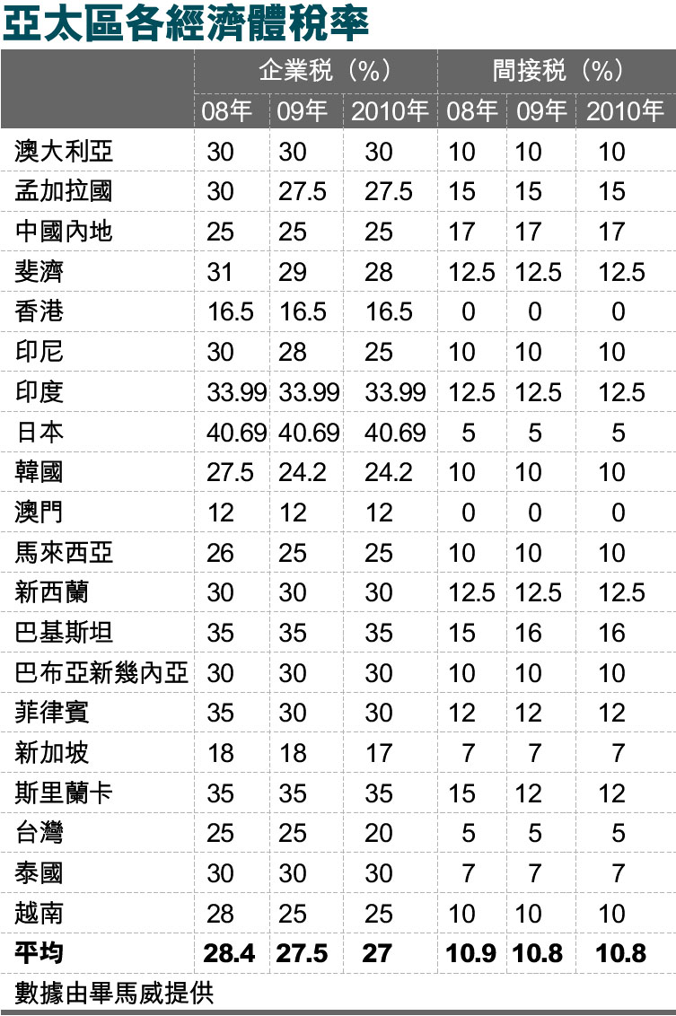 亞太區各經濟體稅率 (2010-07-12) (圖)