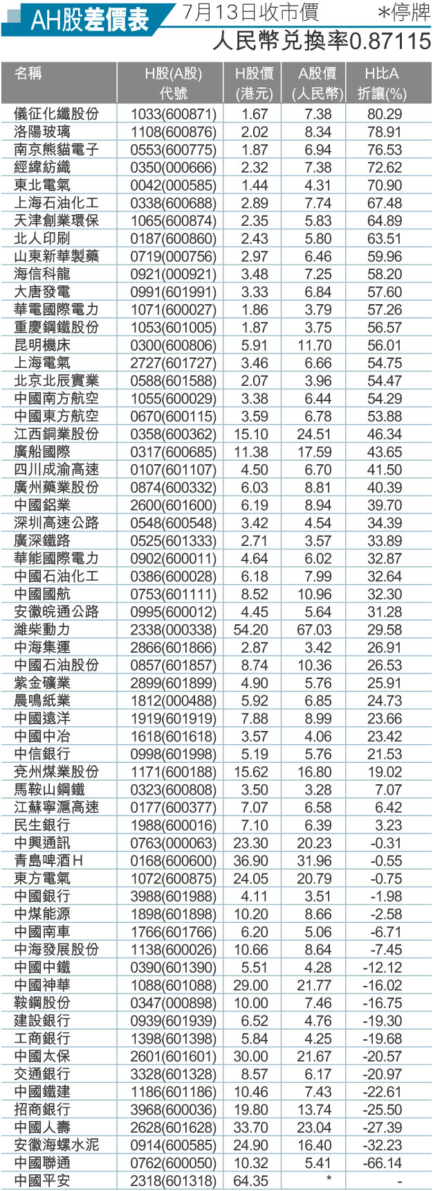 AH股差價表(7月13日收市價)