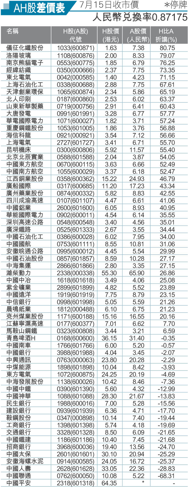 AH股差價表(7月15日收市價) (2010-07-16) (圖)