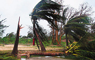 ■海口永興島上的椰子樹被颱風吹得七零八落。 新華社