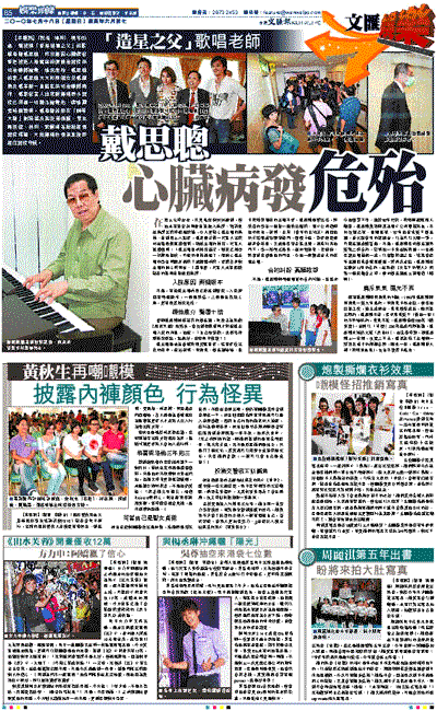 【本報訊】(記者 焯羚) 現年69歲,曾被稱「香港造星之父」的歌唱老師戴思聰,昨日傳因心臟病發昏迷被送入港島區的律敦治醫院深切治療部搶救,情況危殆,戴思聰的家人戴思聰太太和兩個女兒戴蘊慧及戴辛尉一直留在深切治療部陪伴,戴家發言人出來對傳媒表示醫院已用盡一切辦法搶救他,病情需要時間證明。戴老師的朋友「鋼琴大師」劉詩昆及其徒弟孫穎、學生馬浚偉、林利、梁佩瑚等紛紛趕到醫院探望,大批傳媒收到消息後即趕往醫院守候。