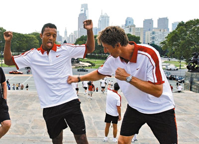 曼聯門將雲達沙(右)在電影《洛奇》的拍攝場景費城美術館,扮拳手與拿尼嬉戲。 路透社