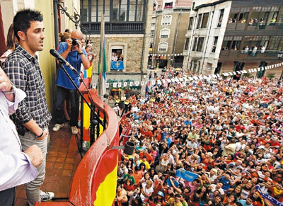 西班牙奪得世界盃,前鋒韋拿(左)返回家鄉薩馬鎮,獲英雄式的歡迎,並獲頒獎章。 路透社