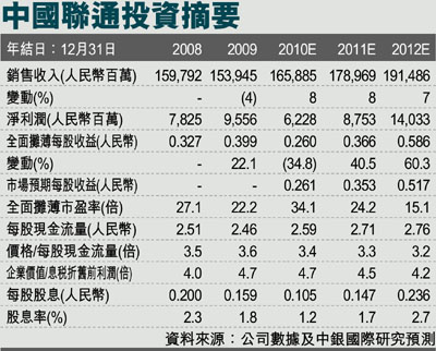 我們預計,中國聯通上半年盈利下降48%至33億人民幣,這主要是由於吸引更多3G用戶入網及使用量增加帶來的網絡運營費用和銷售及營銷費用的上升。息稅折舊前利潤率將縮窄330個基點至38.4%。總收入將增長4%,這主要來自移動業務收入的增長(同比增長14%)。固話業務方面,我們預計由於小靈通及其他固話用戶終止業務以及通信量的流失,收入將同比下降5%。