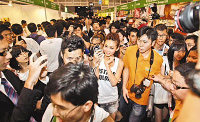 貿發局不讓o靚模在書展舉行簽名會,卻批准她們進場宣傳,多名o靚模昨日突襲書展,所到之處必惹混亂。其中「Donut」寫真出版商專業訂閱昨安排寫真主角現身宣傳,原定即場派發冬甩玩具,惟因場面太混亂,結果只派發海報後提早結束活動。主角之一胡心諾表示,她們以工作人員證件入場,有特別注意衣著,冀以身體語言及眼神吸引讀者,不以性感搶灘,聲言已盡量遵守大會要求,活動前已通知大會,稍後將到酒吧舉行簽名會,未來數日考慮在往會展的天橋上與書迷握手。