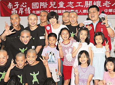 ■賈靜雯(中)以國際兒童義工大使身份,與兒童義工一同慰問住院老人。中央社