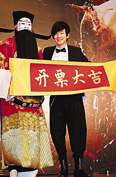 ■由京劇扮相的「曹操」為林俊傑「開票」。中新社