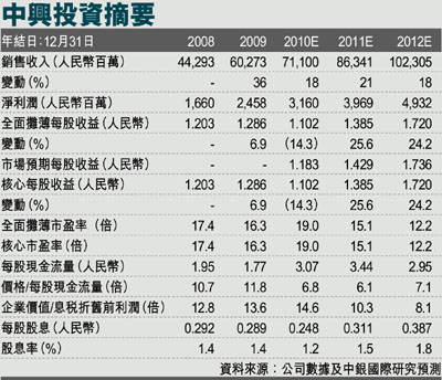 我們將評級由持有上調為買入,基於22倍一年遠期市盈率,將目標價由49.10港元下調至31.00港元。我們的一年遠期每股收益預測為1.42港元,這是我們採用了2010年每股收益預測1.26港元和2011年每股收益預測1.58港元的中值。我們的目標市盈率為22倍,18-25.7倍的遠期市盈率相當於中興通訊04年以來的歷史平均遠期市盈率中值低一個標準差。我們選取了這兩者的中間點作為我們的目標市盈率。一旦投資者的主要擔憂消除,該股將面臨重估。 (摘錄)