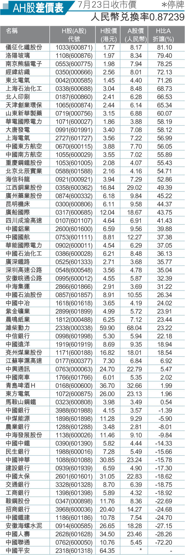 AH股差價表(7月23日收市價) (2010-07-24) (圖)