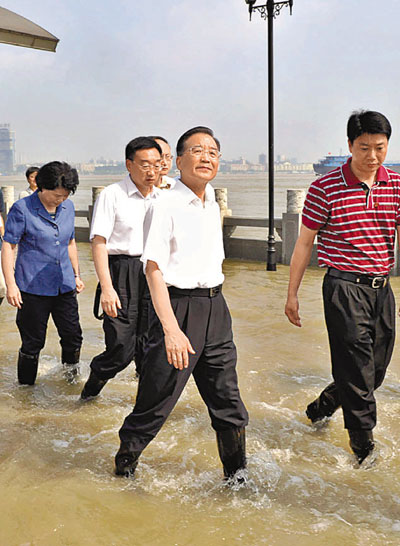 溫家寶23日來到湖北武漢檢查指導防汛抗洪工作。下午3時許,他一下飛機就來到漢口龍王廟險段實地察看汛情。這裡位於長江和漢江交匯處,河道狹窄,水流湍急,是長江著名險段之一,也是武漢防洪的心腹之患。防洪牆外的觀江平台已被江水淹沒。溫家寶蹚著一尺深的江水,考察了龍王廟綜合整治區。「現在長江武漢段的水位是多少?」他關切地問道。「27.13米。這是入汛以來的最高水位。」當地負責人回答道。「流量呢?」「每秒51,200立方米。」從雨情到水情,從汛情到災情,從防汛抗洪到群眾生活安排,溫家寶問得十分細緻。當聽到長江上游和漢江上游最近又降暴雨、水勢正在上漲時,溫家寶叮囑道,要再接再厲,充分準備,迎接新一輪洪水的考驗。