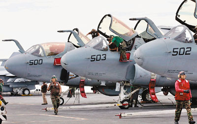 ■美航母上搭載的EA-6B「徘徊者」電子戰飛機。路透社