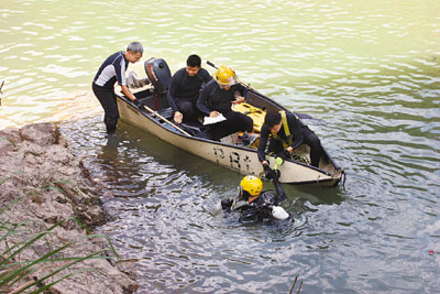 ■消防蛙人繼續在前日找到失蹤青年背囊的水塘處搜索。本報記者蔣焯文 攝
