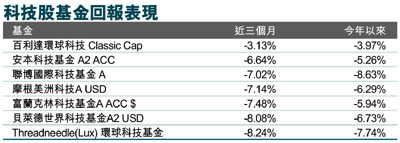 比如佔近三個月榜首的百利達環球科技基金,主要透過包括電訊、互聯網及資料處理服務等科技公司股票,以達致中期資產增值。上述基金在2007、2008和2009年表現分別為-1.8%、-47.73%及63.63%,其資產比重為87.54%股票、12.41%現金、0.04%其他及0.01%債券,而基金平均市盈率和標準差為23.48倍及27.44%。