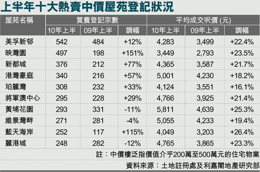 上半年十大熱賣中價屋苑登記狀況 (圖)