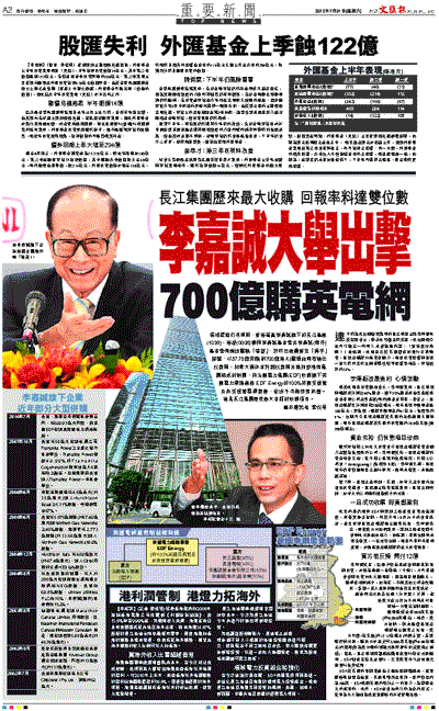 環球經濟仍未明朗,香港首富李嘉誠旗下的長江基建(1038)、港燈(0006)聯同李嘉誠基金會及李嘉誠(海外)基金會伺機出擊執「筍貨」,於昨日凌晨簽定「握手」協議,以57.75億英鎊(約700億港元)擊退由阿布達比投資局、加拿大退休金計劃投資局及澳洲麥格理集團組成的財團,向法國電力集團(EDF)收購旗下英國電力網路業務 EDF Energy的100%英國受規管及非受規管電網資產,發出不可撤回要約書。這是長江集團歷來最大金額的收購項目。 ■本報記者 梁悅琴