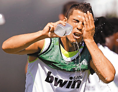 西甲豪門皇家馬德里在美國洛杉磯備戰熱身賽,C.朗拿度淋水降溫。 路透社