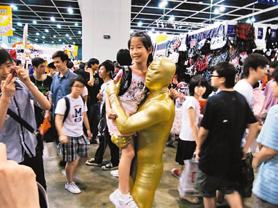 昨日上午11時,一個神秘「金人」在人山人海的會展中心香港動漫節出現,他做著各種舞蹈動作,並友善地同場內青少年交流,引起陣陣哄動,吸引了大批人與他合照,不少觀眾爭相與「金人」握手。有人問他姓名,他就說:「我叫Danny Chan,要想知道我是誰,請在網上搜尋。」 ■本報廣東新聞中心記者熊君慧、李望賢31日電