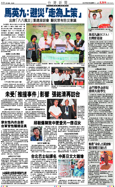 【本報訊】綜合中通社及中新社報道:台灣「八八風災」將屆一周年,馬英九昨日再次強調,民眾要有避災、離災的觀念。他以「三十六計走為上策」形容避災、離災觀念。他認為,風災時有20多鄉鎮撤離9,000多人,如果當時不撤,會有上千生命再損失。