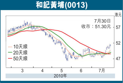 和黃於7月19日在退至47.5元水平重獲承接,經過連續反覆造好,及至上周攀高至51.75元始初現阻力,最後以51.3元報收,惟現價較低位已回升了8%,而現價亦已企於10天、20天及50天等多條重要平均線之上,論走勢已有轉好跡象。瑞信集團在剛發表研究報告中指出,和黃稍後公布上半年業績,將錄得盈利42億元,下跌27%,但若撇除09年的一次性收入53.6億元,持續盈利則由4.05億元大升至42億元。